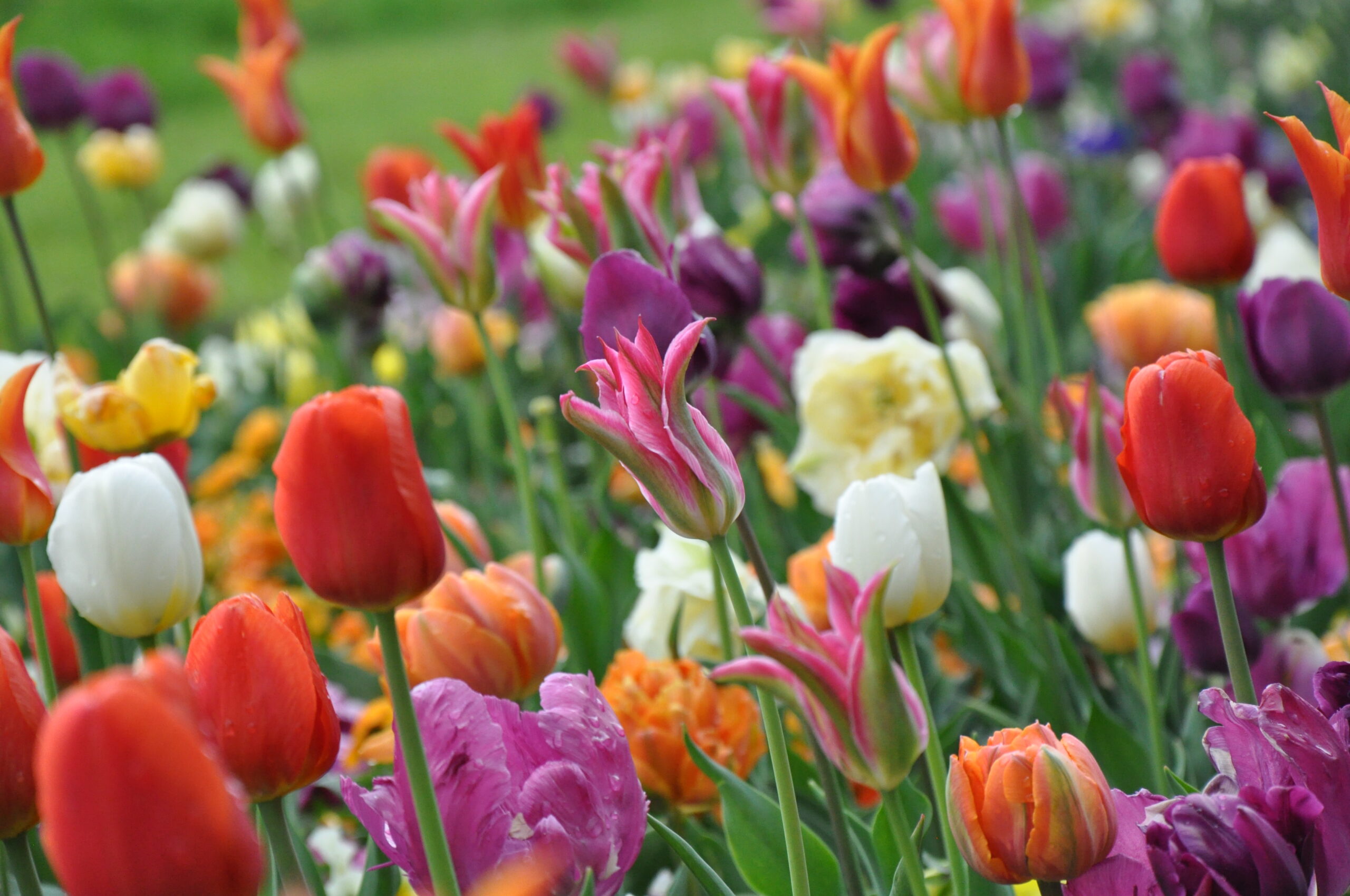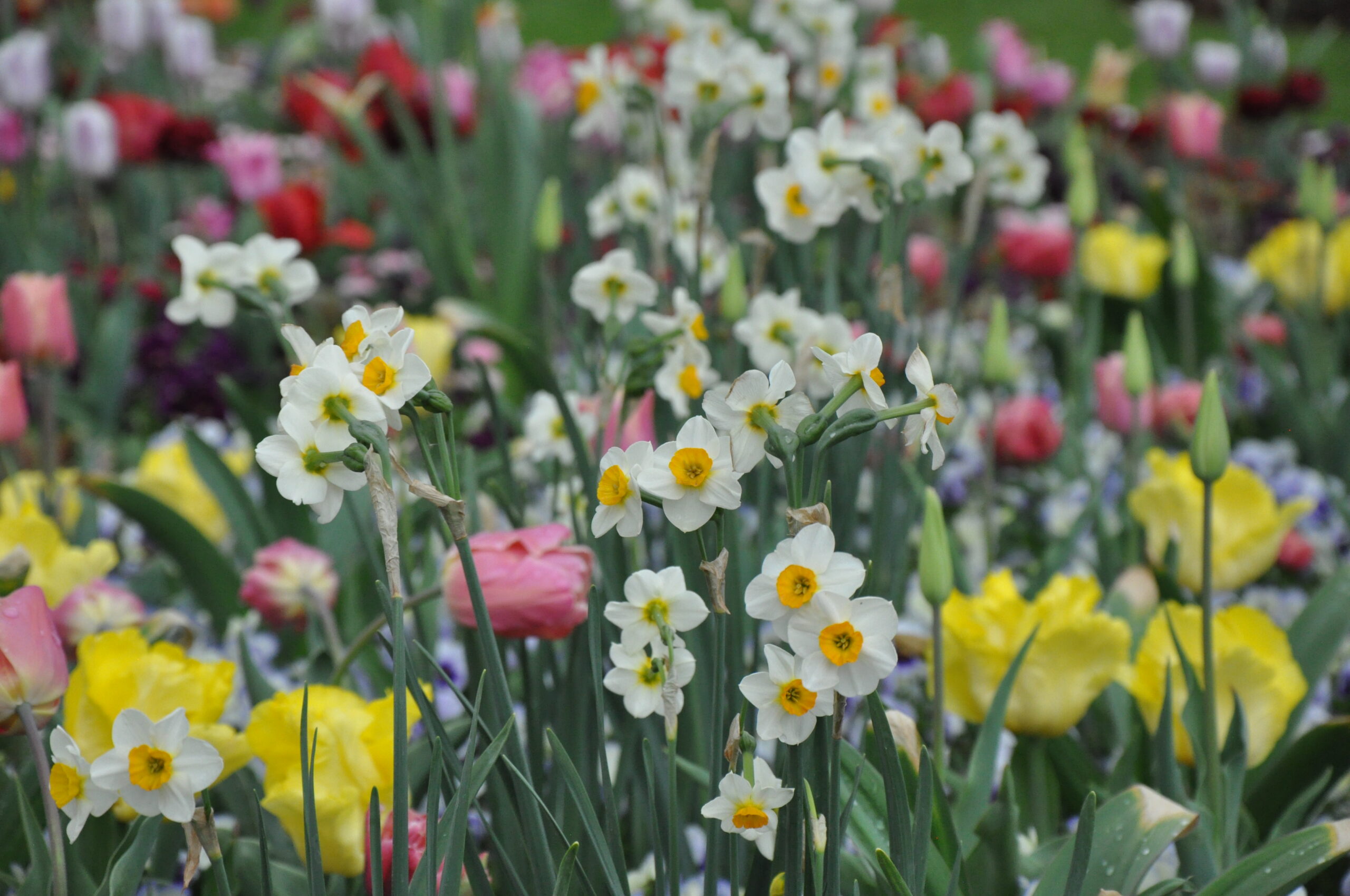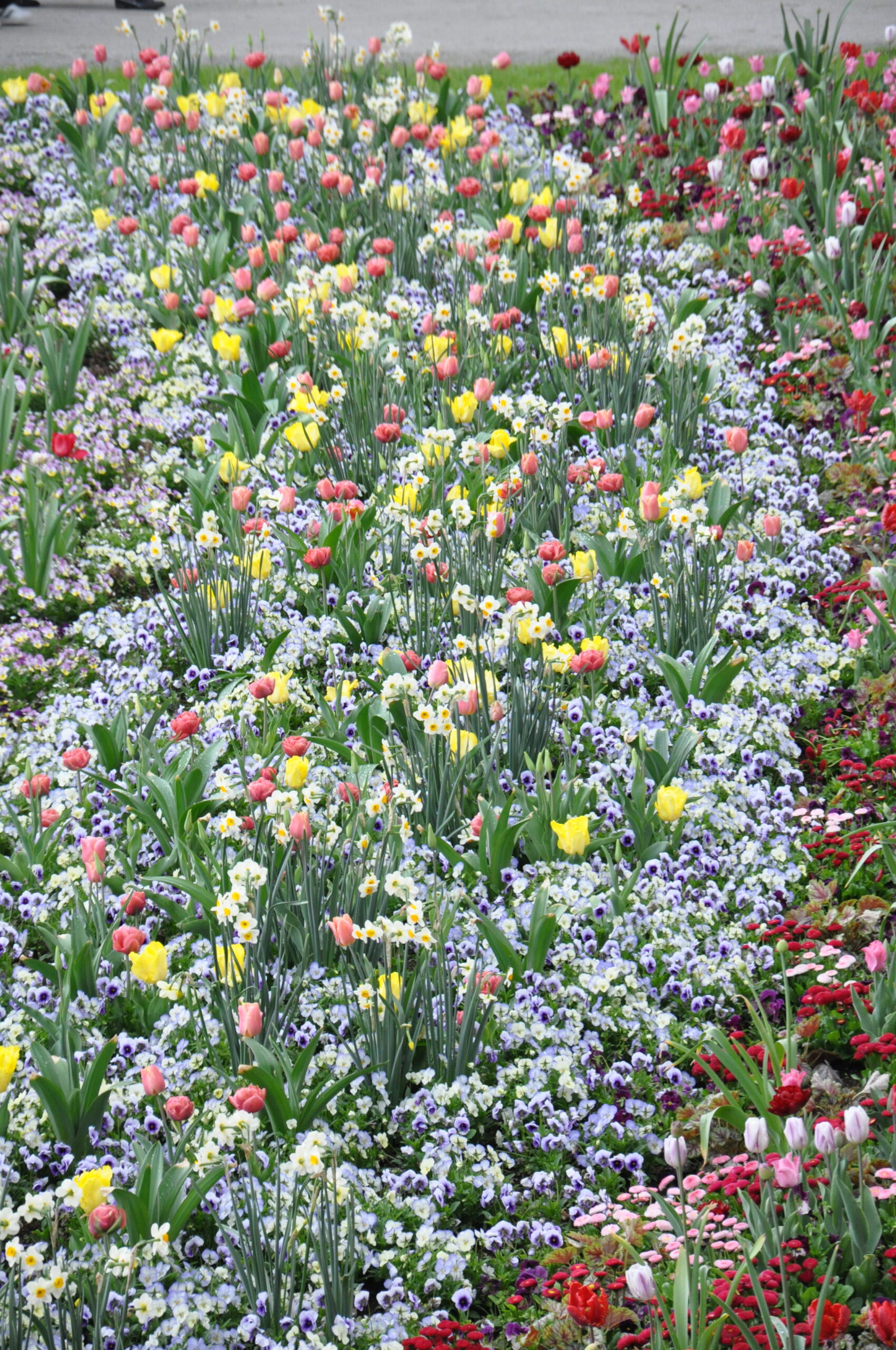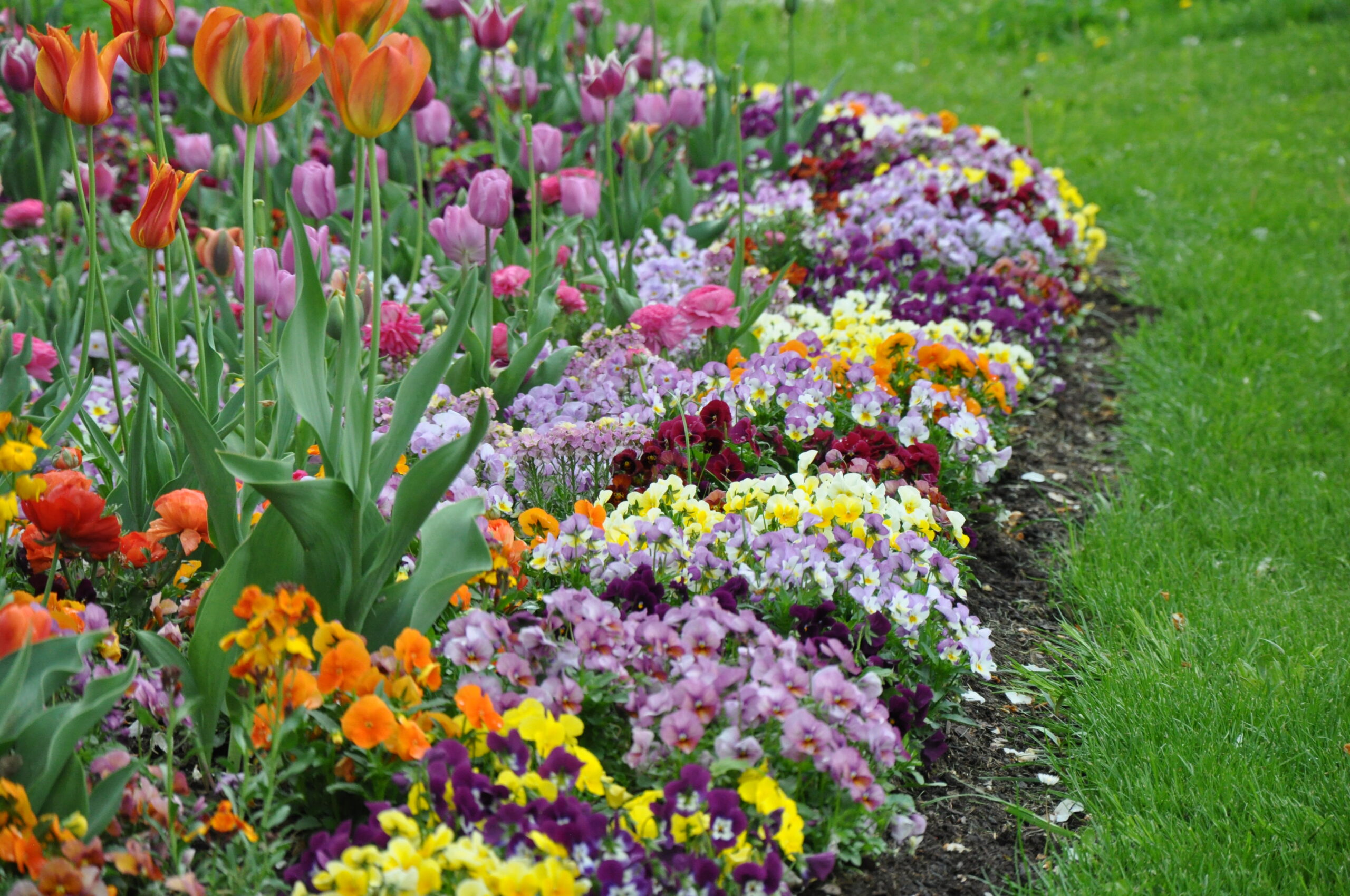 Unterschiedliche Streifen in Regenbogen-Form, die sich wiederholen – und in den Streifen werden wahre Schätze gezeigt! Entzückende kleinblütige Narzissen, gefüllte Tulpen in der Farbe Apricot, viele zweifärbige Tulpen und Frühlingsblumen in wunderschönen Farben – Ranunkeln, Hornveilchen, Bellis und Vergissmeinnicht.