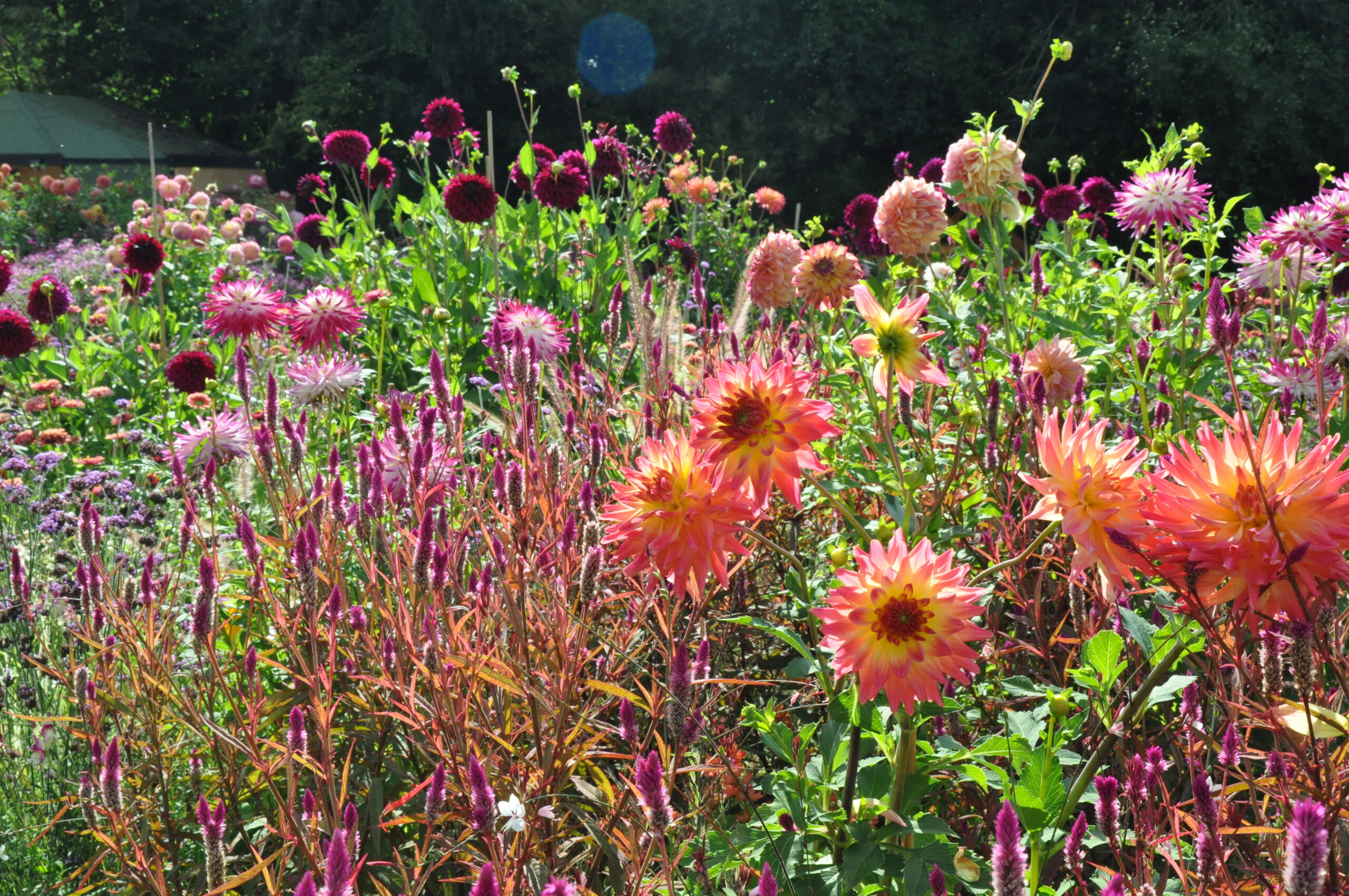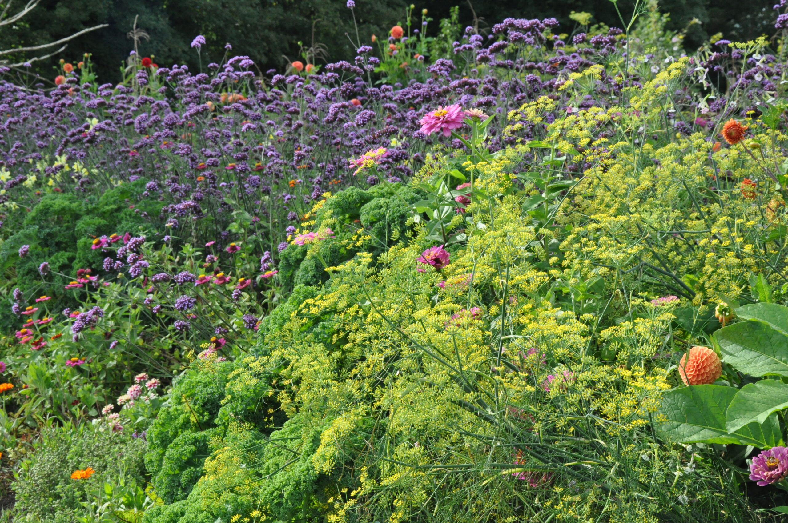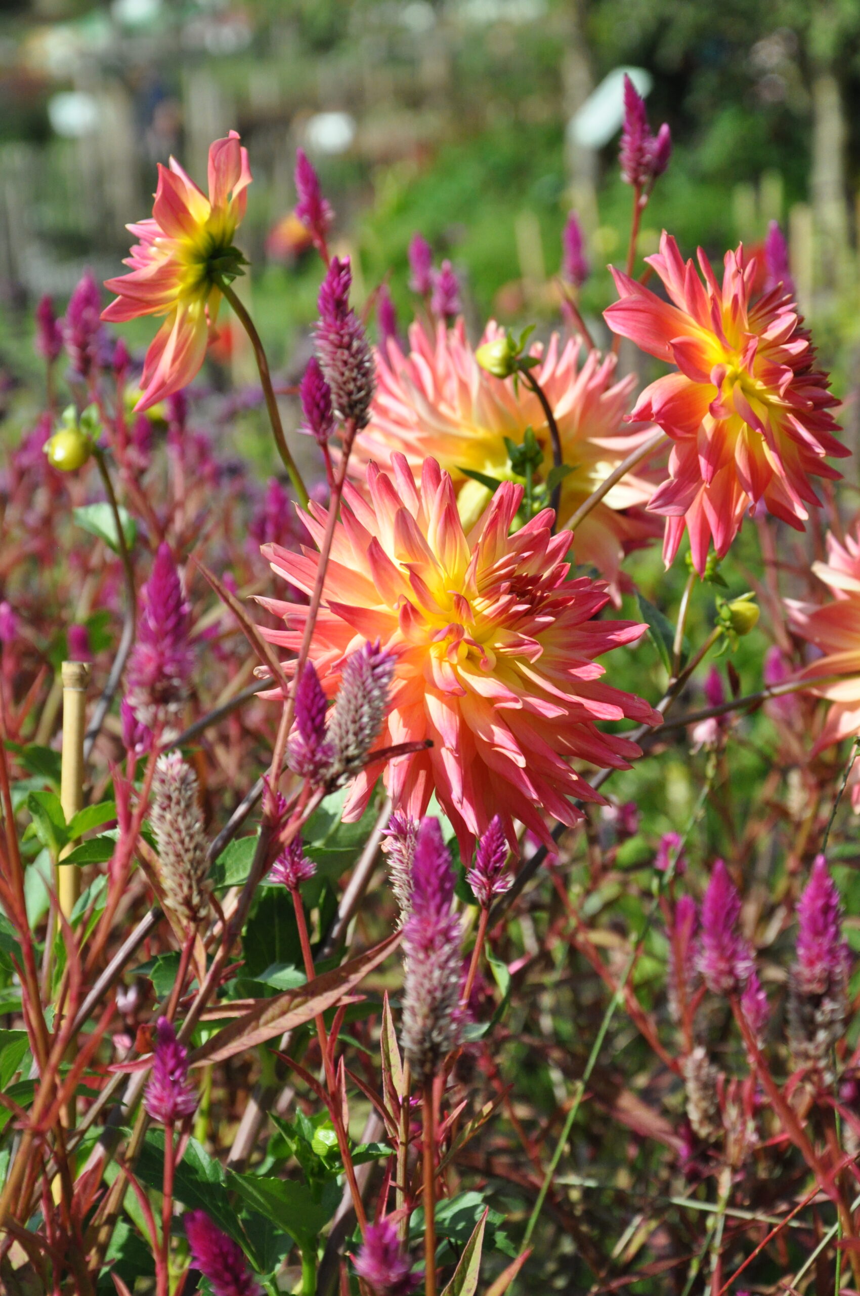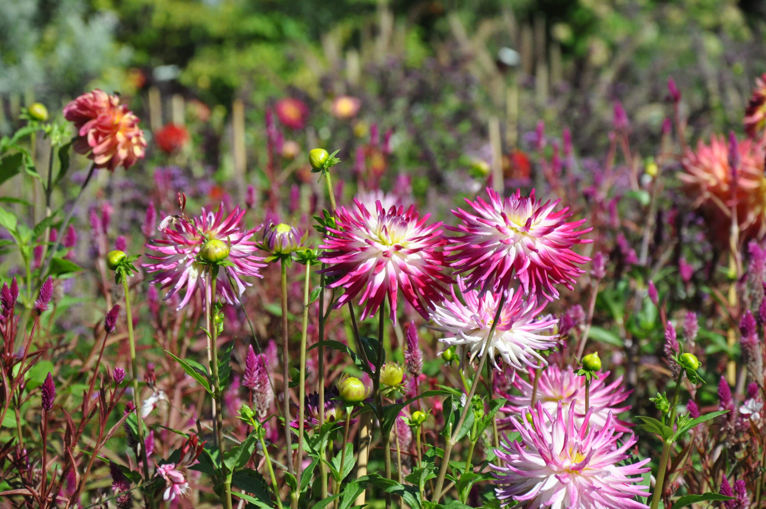 Unterschiedliche Streifen in Regenbogen-Form, die sich wiederholen – und in den Streifen werden wahre Schätze gezeigt! Großblütige, zweifärbige Dahlien, kombiniert mit filigranen Sommerblumen, wie Eisenkraut, Celosien oder Spinnenblumen.