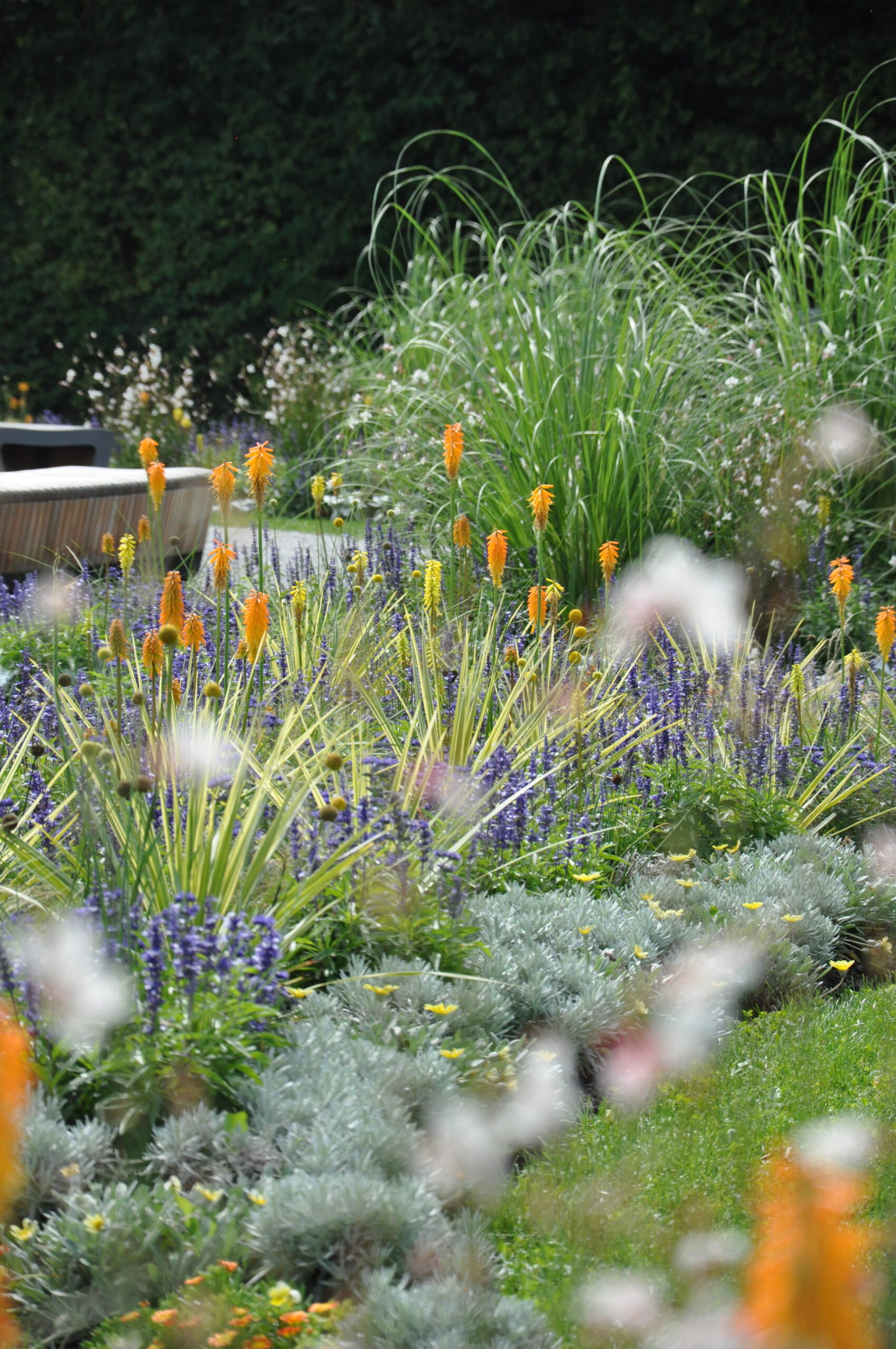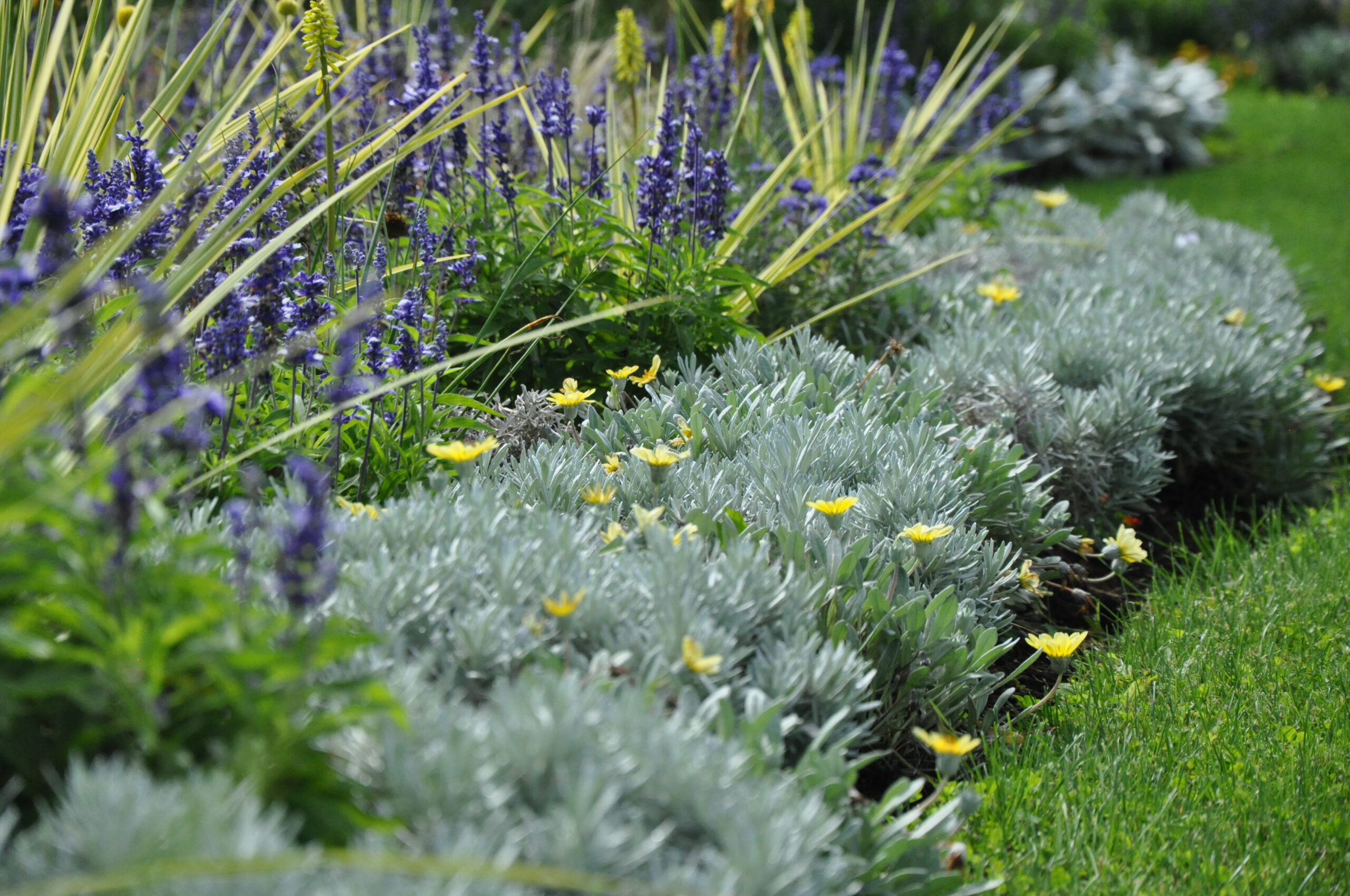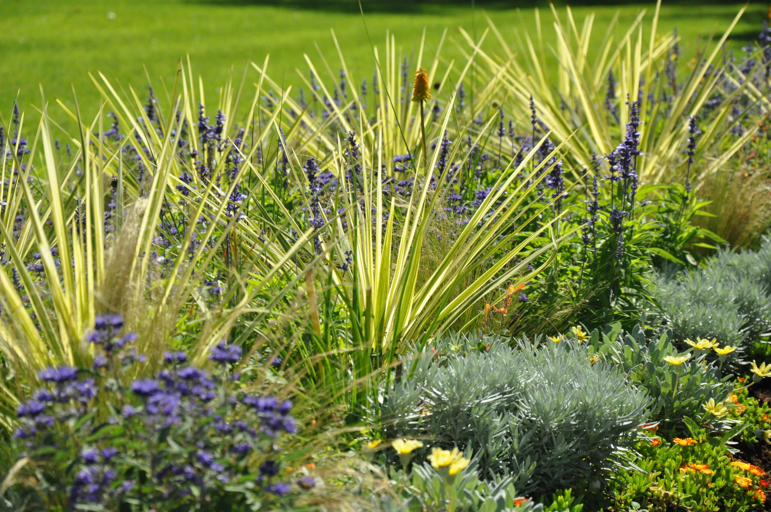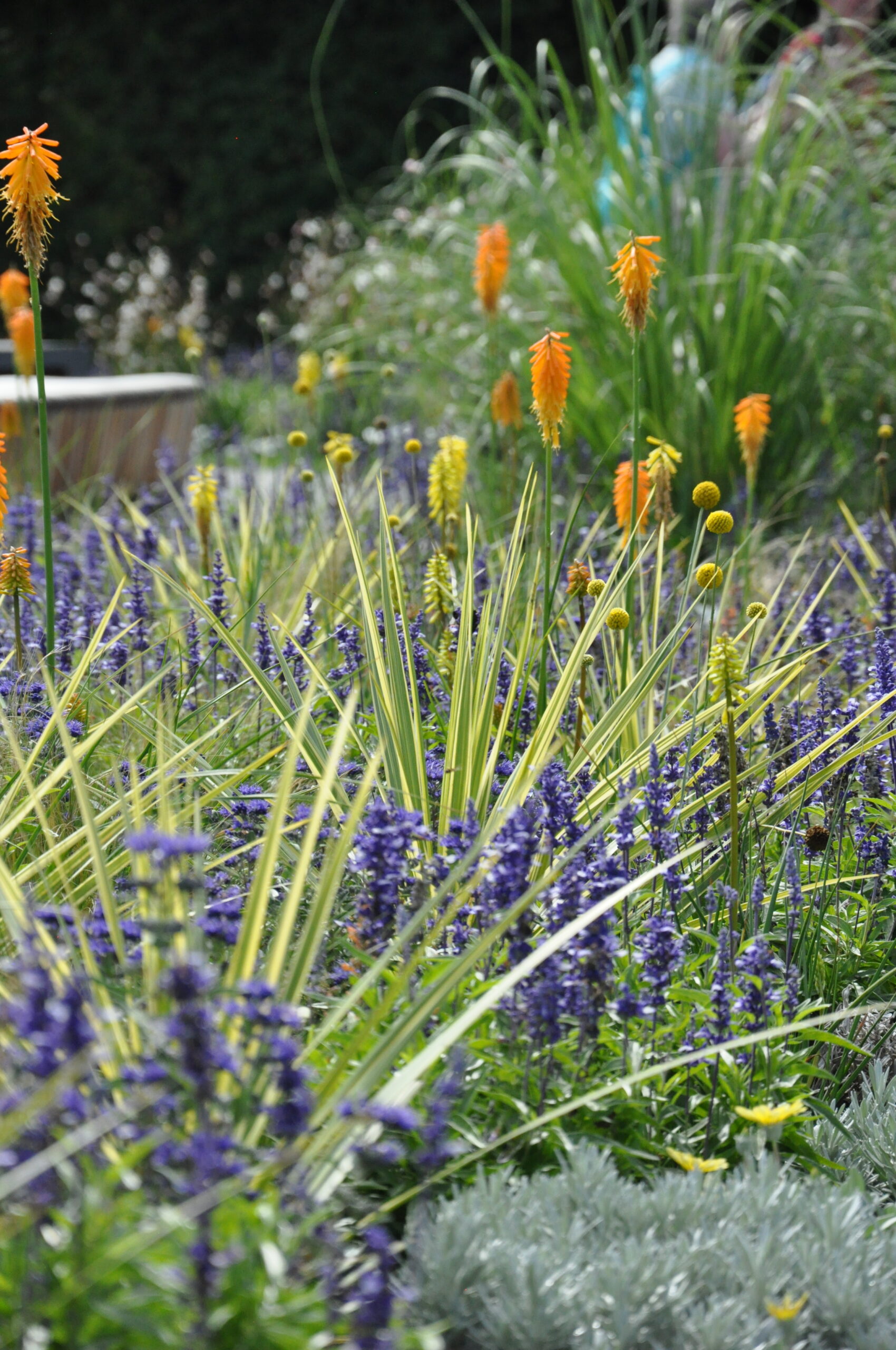 Sommerblumen und auch Stauden in gelb-orange-weiß-silber gehalten. Die straff aufrechten Fackellilien und Keulenlilien werden umspielt von Salbei, Duftnesseln und Bartblumen. Eingefasst durch silberlaubige Hitzekünstler.