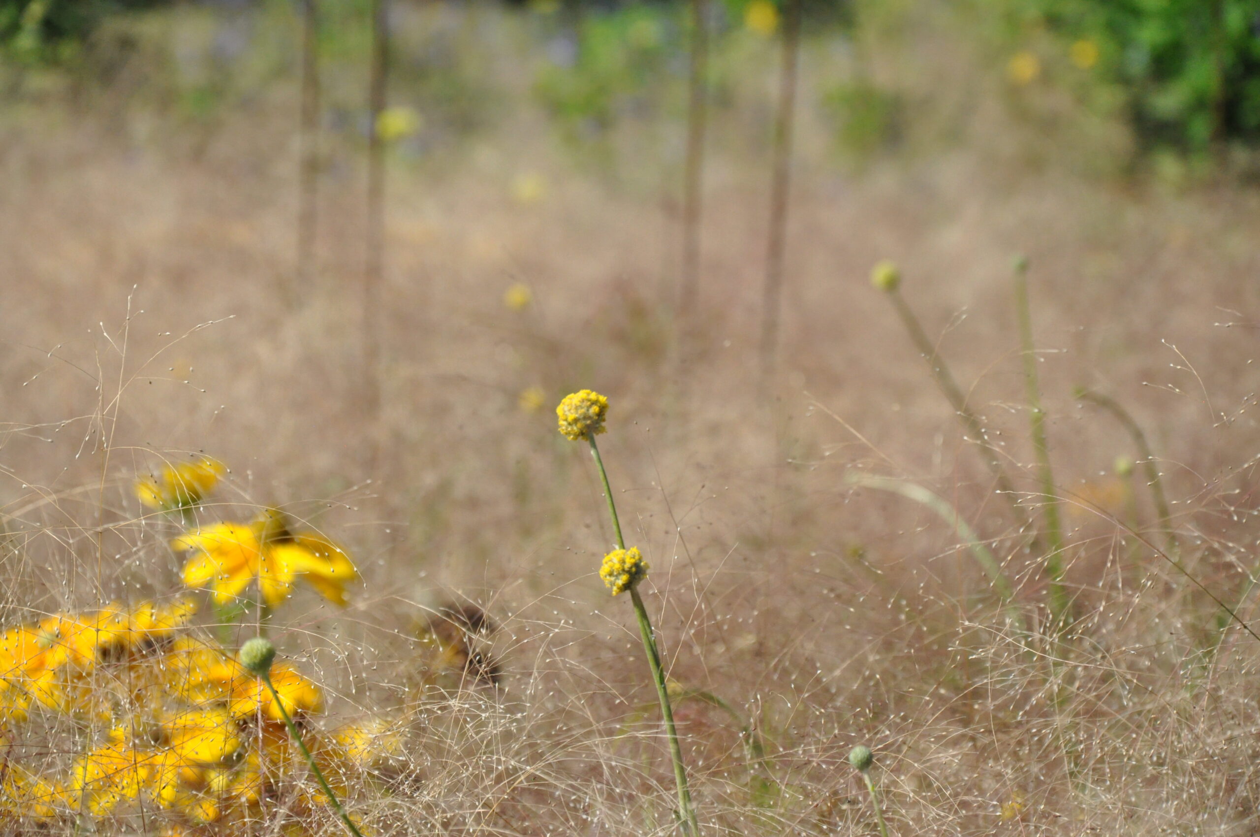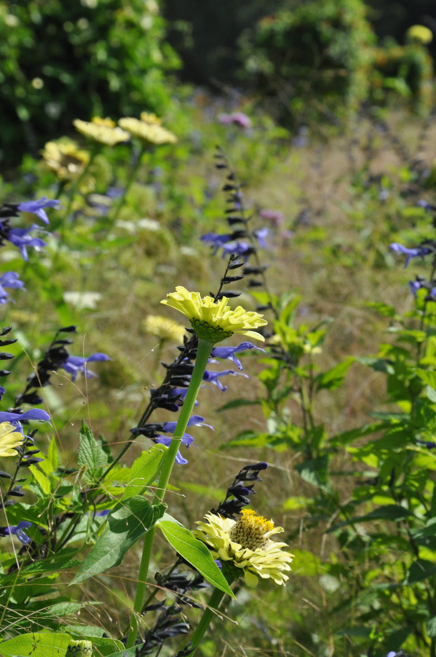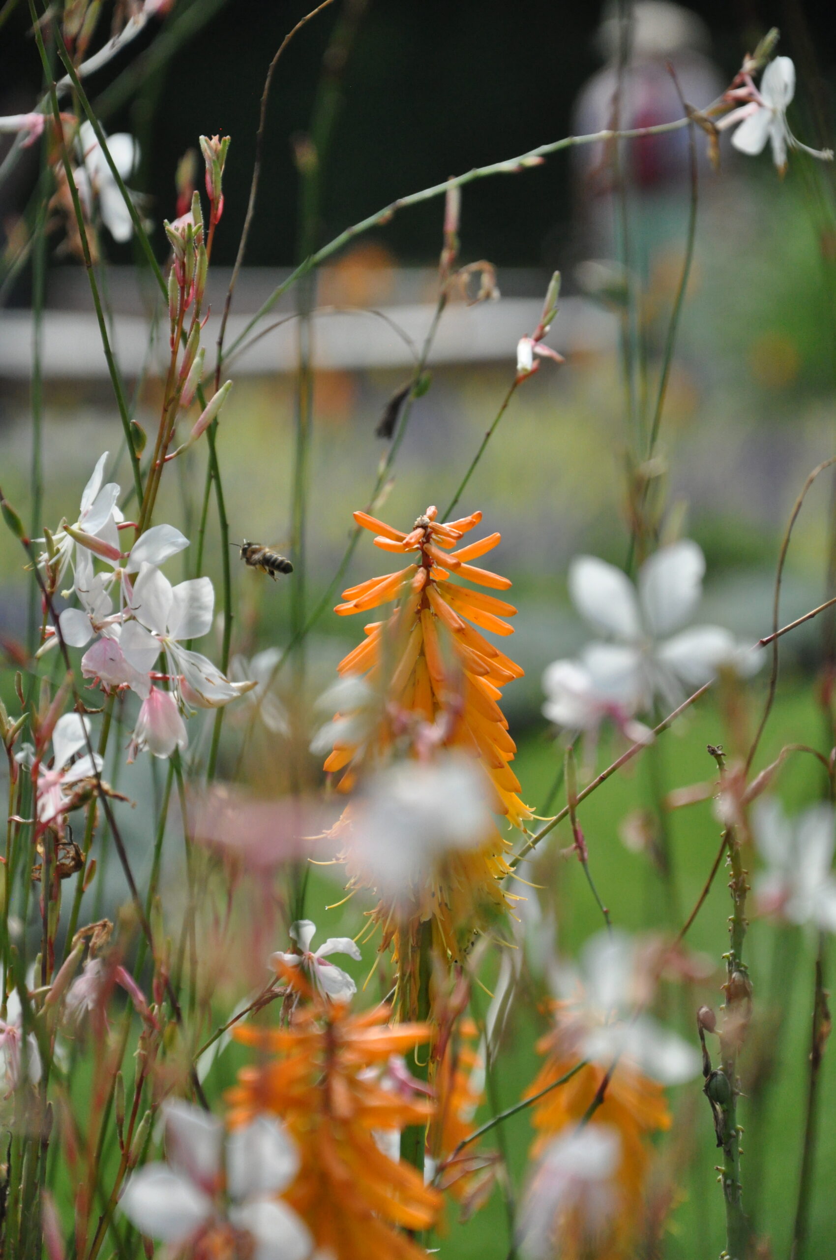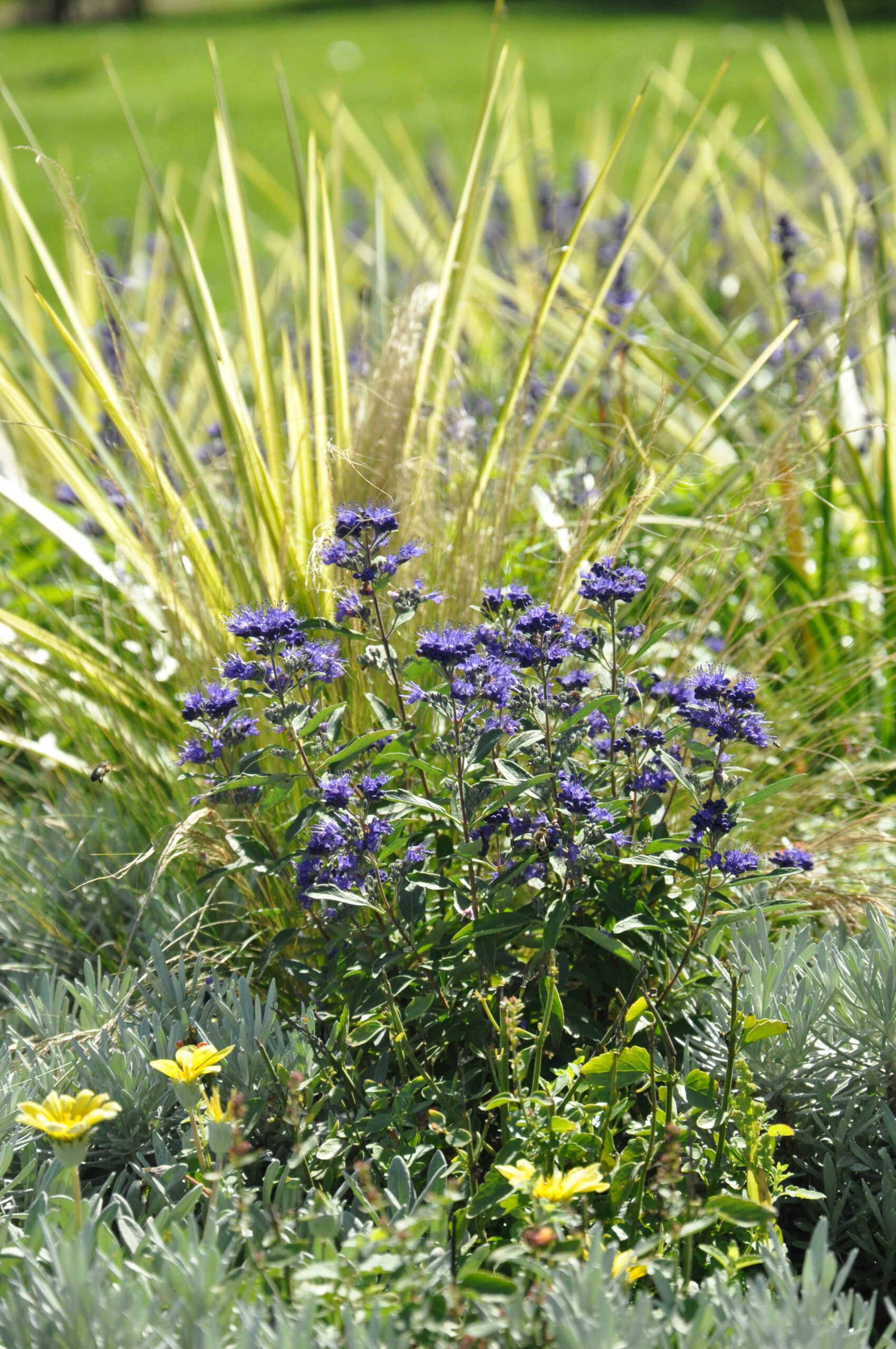 Sommerblumen und auch Stauden in gelb-orange-weiß-silber gehalten. Die straff aufrechten Fackellilien und Keulenlilien werden umspielt von Salbei, Duftnesseln und Bartblumen. Eingefasst durch silberlaubige Hitzekünstler.