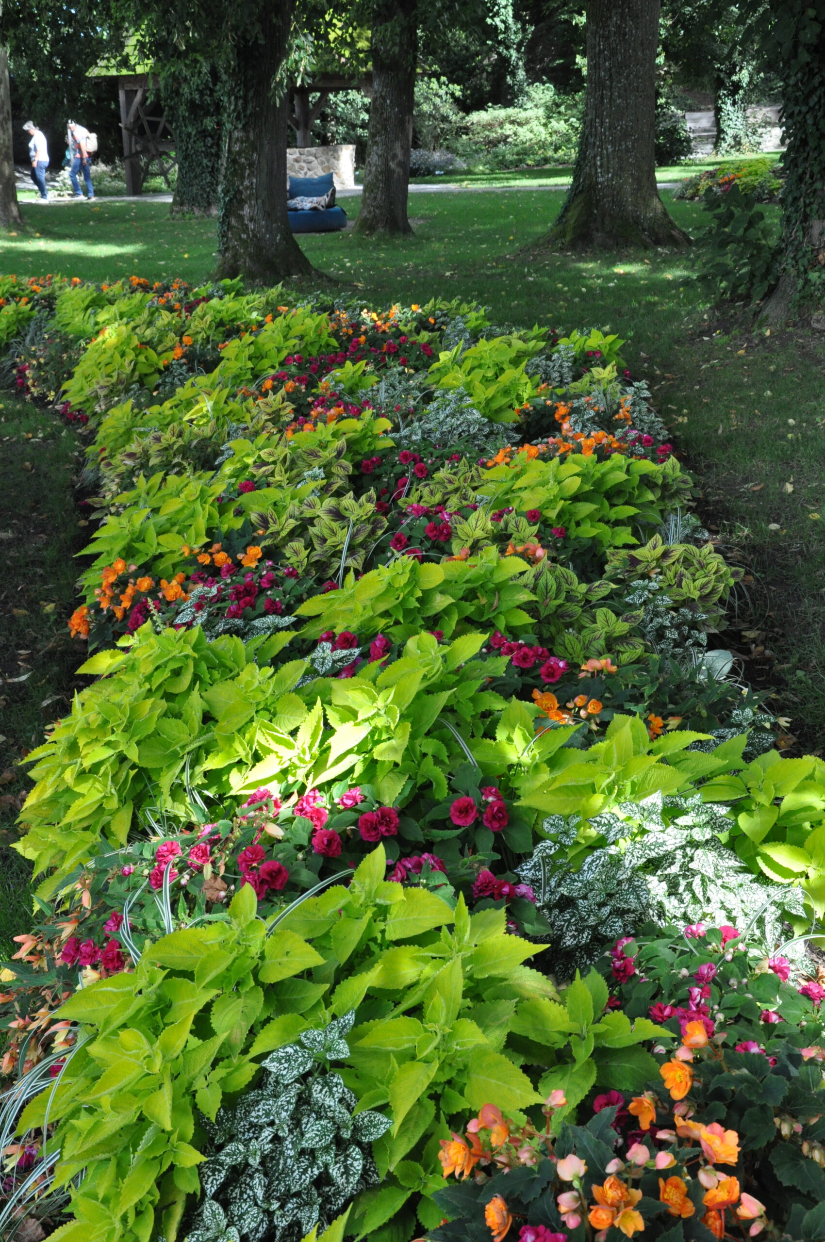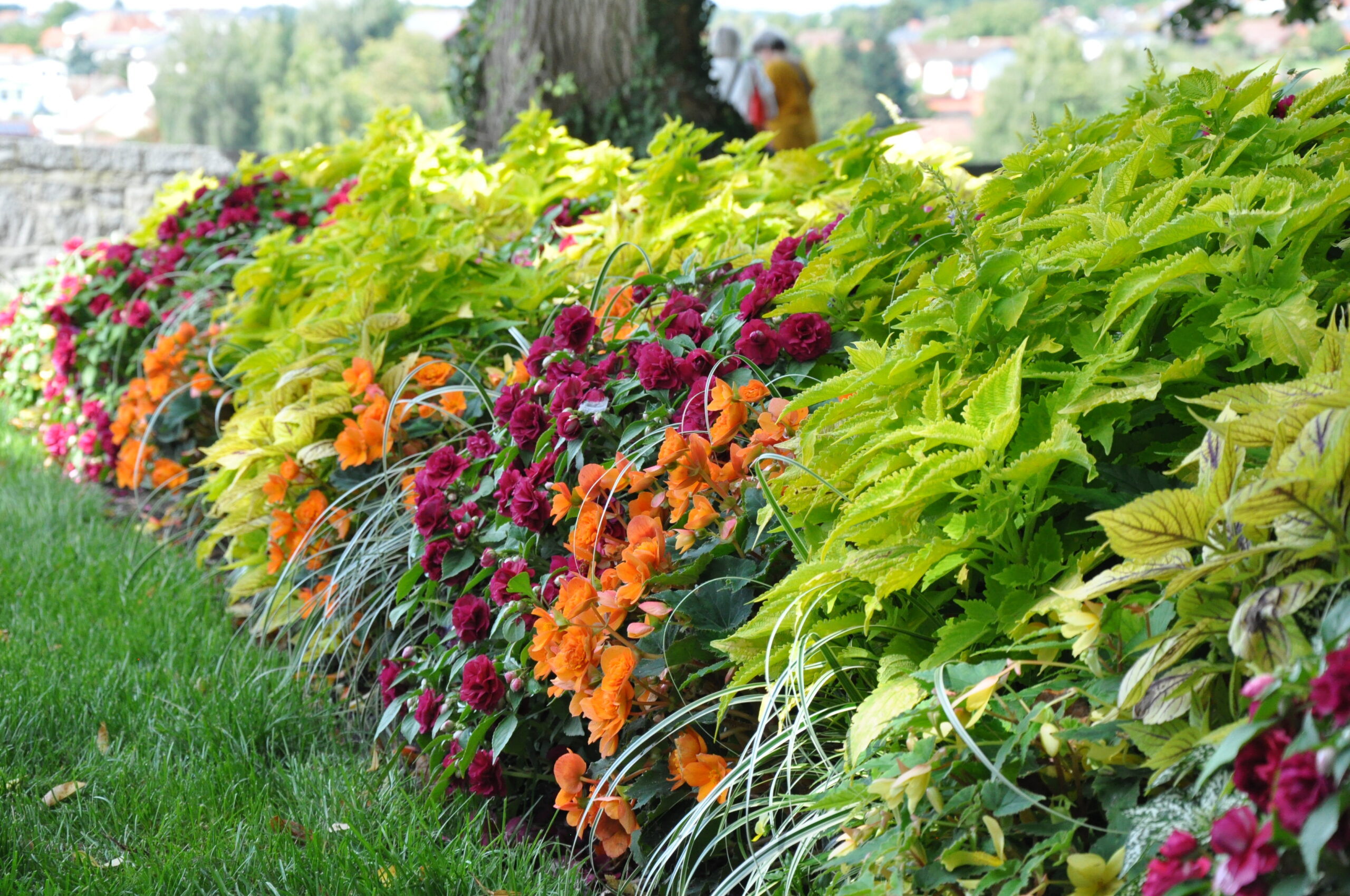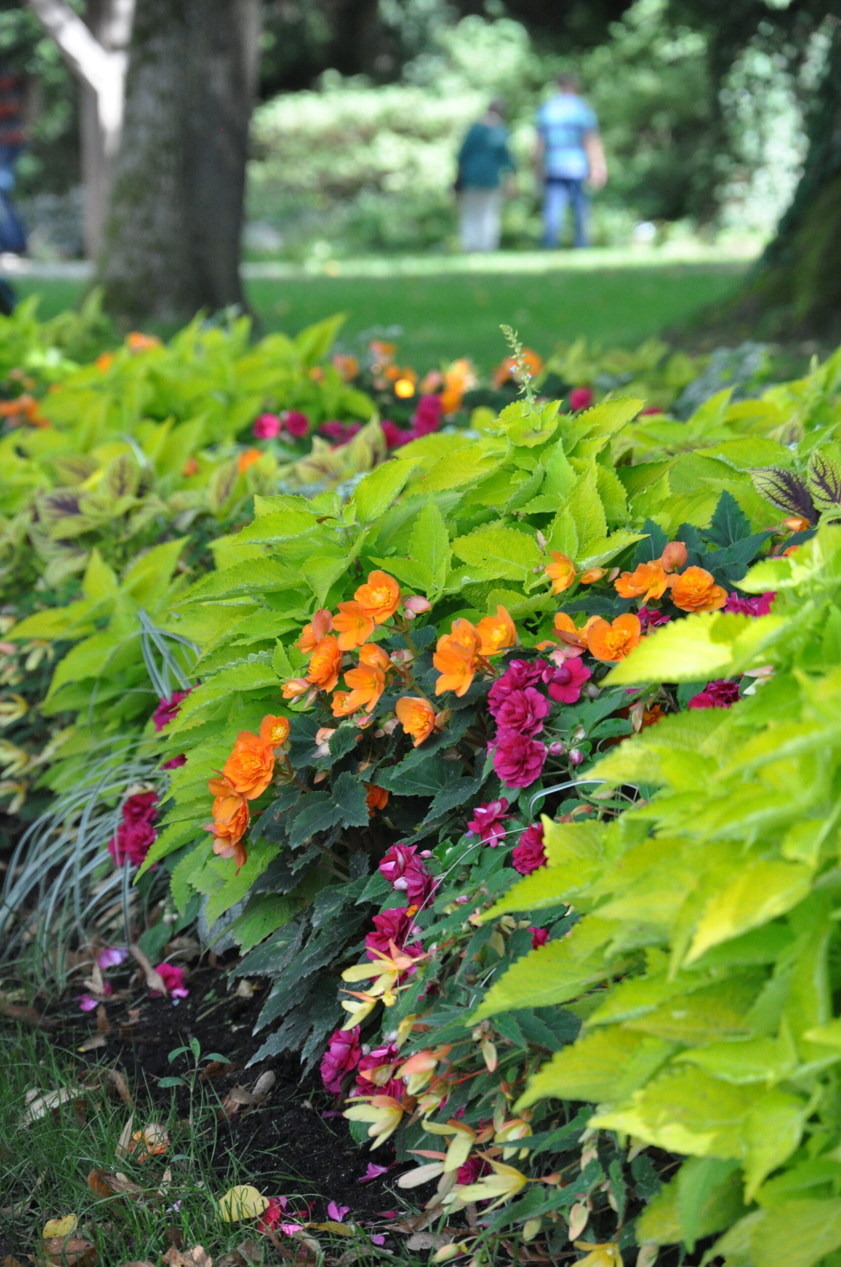 Flache Beet mit umso mehr Farbe für die Beete im Baumschatten. Buntnesseln, Farne und Gräser bilden die Struktur, Farbe kommt von unterschiedlichen Begonien und Fleißigen Ließchen.